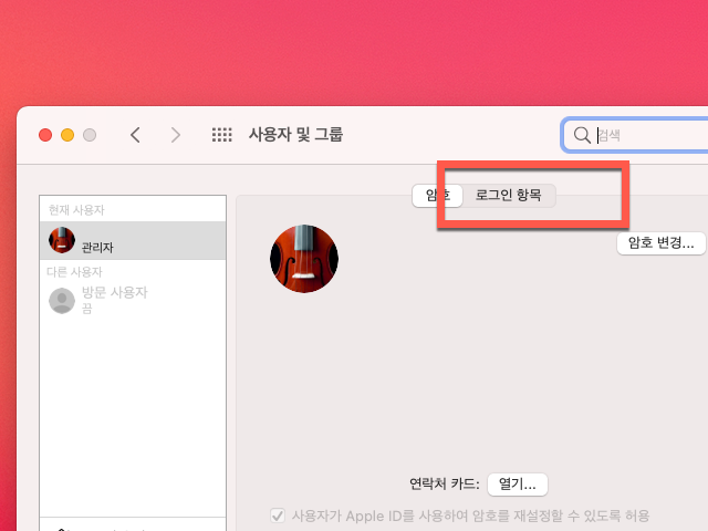 로그인하여 사용하는 사용자 아이디를 선택한 다음 <로그인 항목>을 선택하여 변경을 해주셔야 합니다