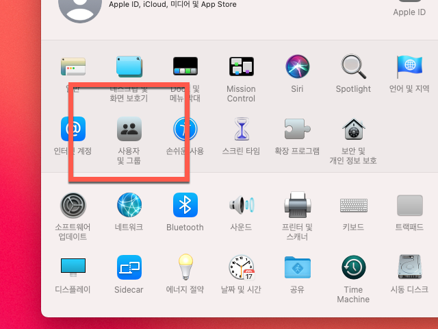 소프트웨어 업데이트, 네트워크 설정, 사이드카(Sidecar) 등의 설정도 변경할 수 있는 환경설정에서 <사용자 및 그룹> 아이콘을 클릭합니다