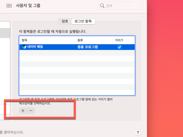 다음으로 로그인 항목으로 이동을 하면 화면과 같이 로그인할 때 자동으로 실행되는 목록에서 취소하고자 하는 응용프로그램을 선택 후 아래에 있는 마이너스(-) 표시 버튼을 클릭해 주시면 이후에는 더 이상 자동 실행되는 모습을 보지 않을 수 있게 됩니다