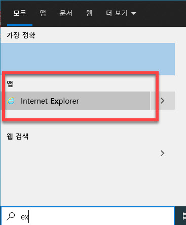 검색창에서 internet explorer 단어의 일부인 “EX” 를 입력하여도 설치되어 있는 앱 목록에서 결과를 찾을 수 있습니다
