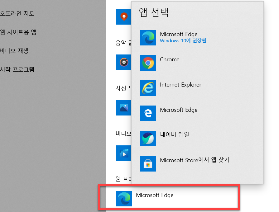 윈도우10 기본 인터넷 브라우저 변경하기