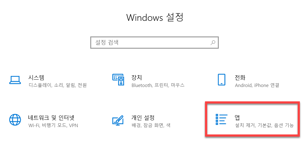 <Windows 설정> 윈도우 구성에서 <앱> 의 설치 및 제거 그리고 옵션 기능의 변경을 할 수 있는 항목을 선택을 하여 세부 수정 페이지로 넘어가야 합니다