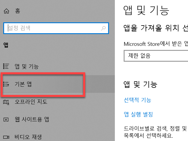 바뀐 윈도우 화면의 왼쪽 리스트 항목에서 <기본 앱> 을 선택합니다