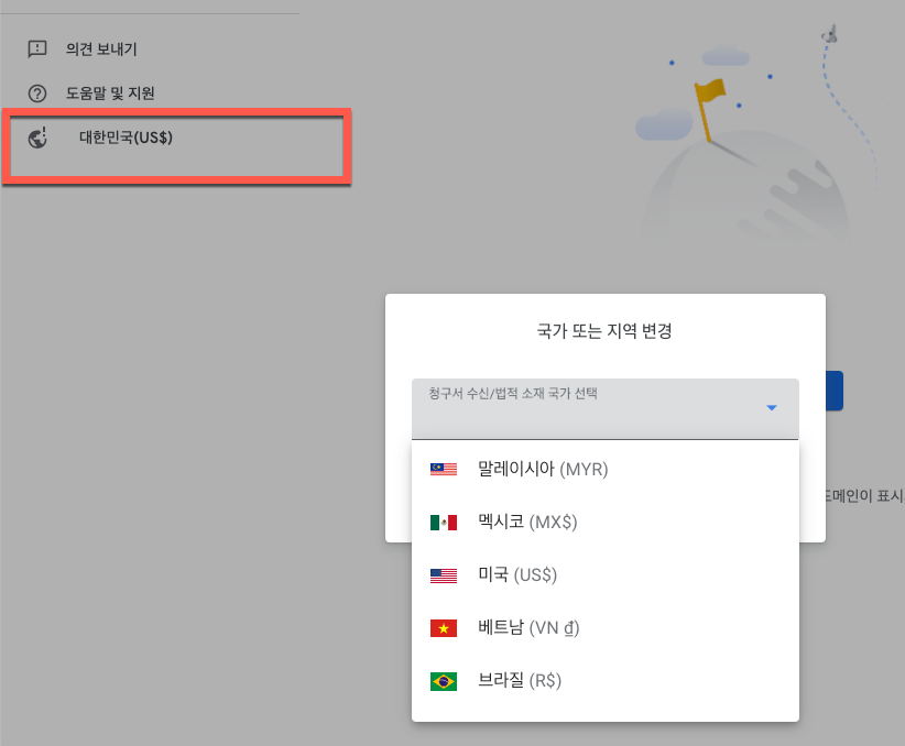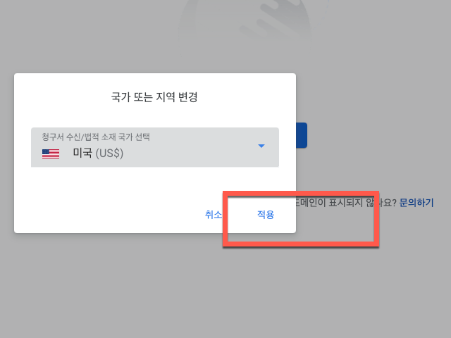 화면 좌측에 있는 국가와 화폐단위를 클릭하여 국가를 미국으로 변경해 주시면 간단하게 해결할 수 있습니다