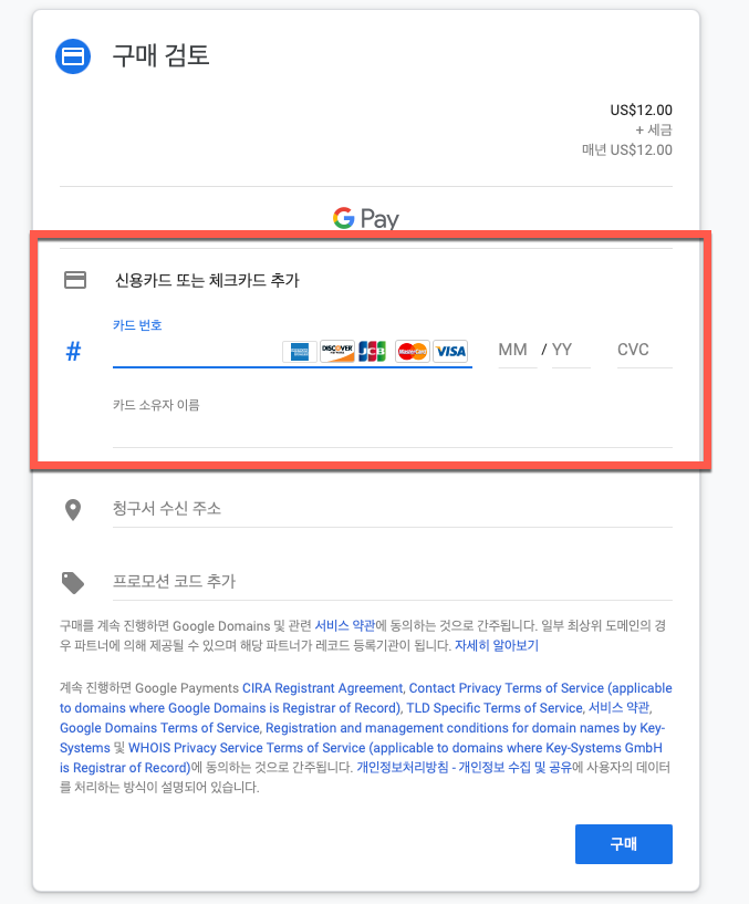 결제하려는 신용카드 번호와 유효일자 그리고 CVC 정보를 입력하는 과정으로 구글에서 도메인 구입 작업이 마무리됩니다