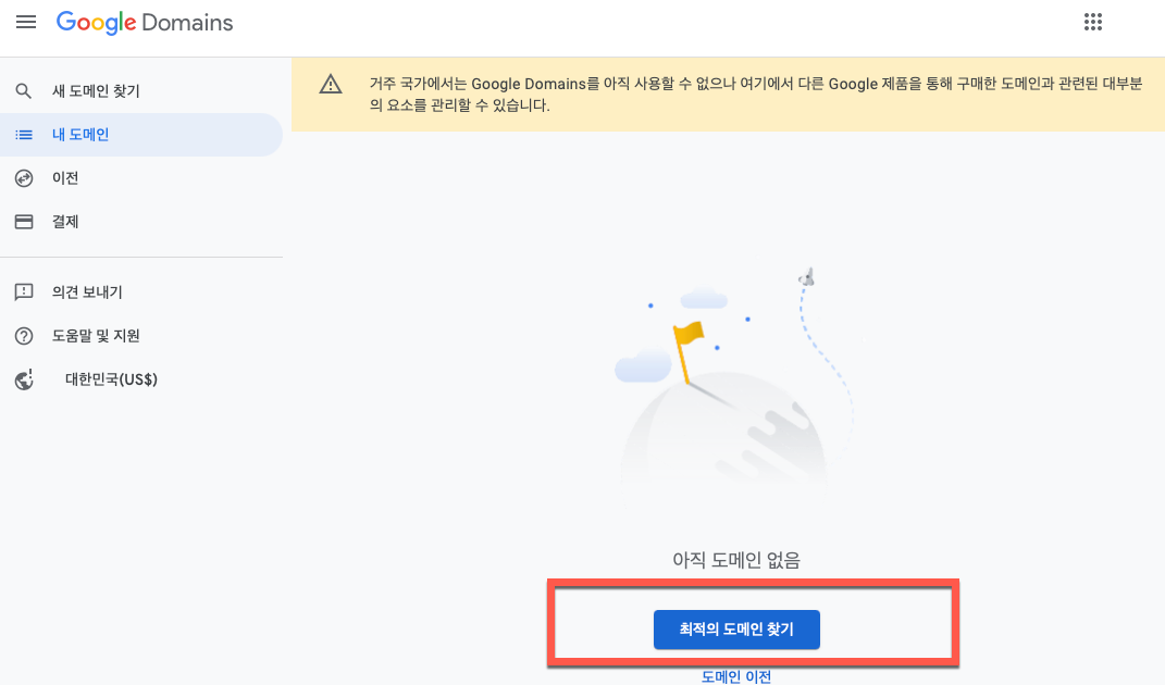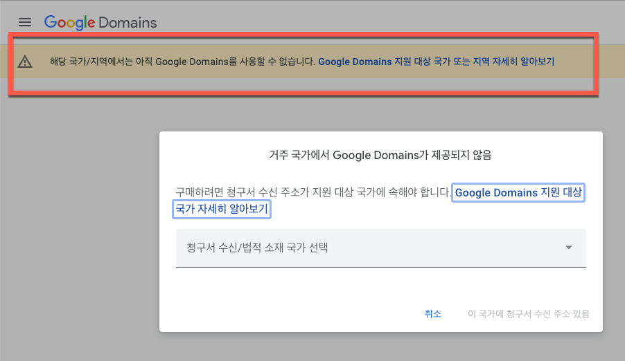 스크린 샷과 같이 초기 페이지에서 “해당 국가/지역에서는 아직 Google Domains 을 사용할 수 없습니다” 라는 문구가 표시가 되면 현재 접속한 국가에서는 구입을 할 수 없기 때문에 환경 설정의 수정이 필요합니다