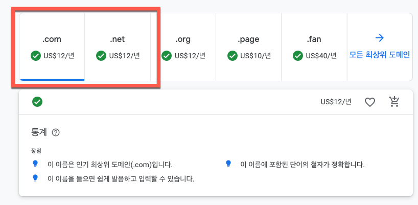 표시된 최상위 도메인 중에 인지도가 가장 높은 닷컴을 선택하면 장점에 대한 설명이 추가로 표시가 됩니다
