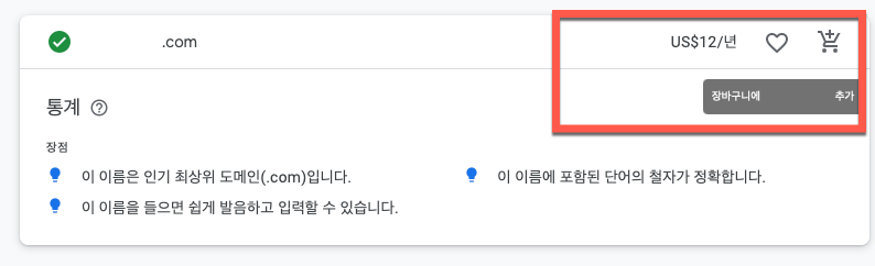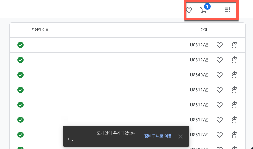 장바구니에 정상적으로 추가가 되었다면 그림과 같이 담긴 도메인 개수가 표시가 보입니다
