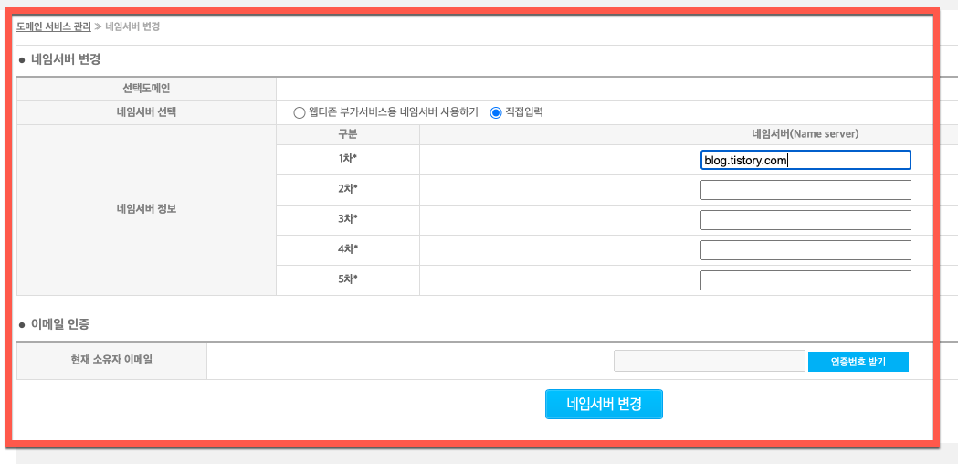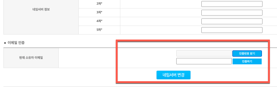 표시되어 있는 이메일 주소로 “인증번호 받기” 를 하여, 메일함에 도착한 메일 내용에 있는 인증번호를 복사&붙여넣기를 하여 <인증하기> 버튼 클릭과 함께 아래에 있는 <네임서버 변경> 버튼을 클릭해야 합니다