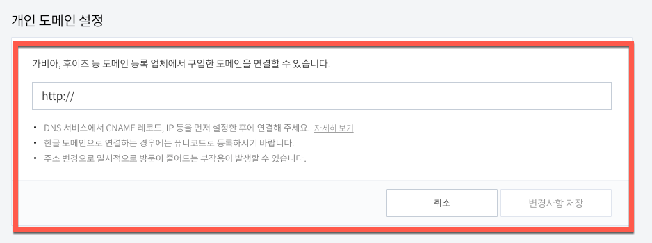 연결하려는 개인 도메인 주소를 입력 후 <변경사항 저장> 클릭하면 마무리가 됩니다