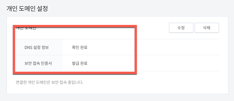소유권을 가지고 있는 도메인의 네임서버 연결이 완료되었다면 <DNS 설정정보> 에서 “확인 완료” 로 바로 변경이 되며, <보안 접속 인증서> 의 발급은 잠시 시간이 소요가 됩니다