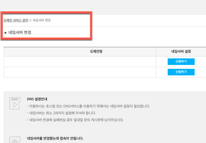 해당 문제를 먼저해결하기 위해서는 <네임서버 변경> 메뉴를 선택하여 <신청하기> 로 변경 작업이 먼저 필요합니다
