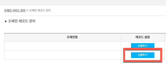 등록하여 사용하고 있는 도메인 명의 <레코드 설정> 영역에 있는 <신청하기> 를 선택하여 작업을 진행해 주시면 됩니다