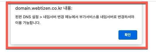 만약 위에서 진행해야 하는 과정으로 혹시 진행이 되지 않고 그림과 같이 <네임서버 변경 메뉴에서 부가서비스용 네임서버로 변경 하셔야 이용 가능합니다> 의 오류 팝업창이 잠시 보이는 경우가 있습니다