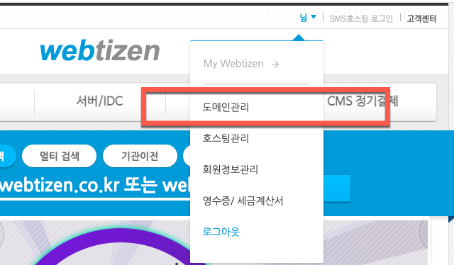 웹티즌에서 홈페이지 주소로 사용하는 도메인을 가지고 있다면 먼저 아이디와 비밀번호를 입력하여 로그인을 하셨다면 모니터 화면 상단의 <로그인> 링크가 있던 부분을 클릭하면 표시되는 목록에서 <도메인 관리> 를 선택합니다