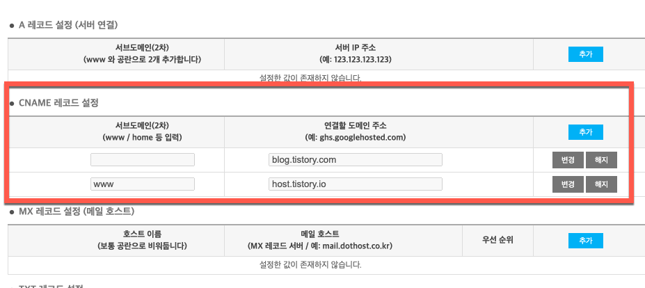 문제를 해결 하셨다면 <도메인 레코드 관리> 메뉴로 이동하여 <CNAME 레코드 설정> 아래에 있는 항목에서 티스토리 홈페이지 공지사항으로 안내하고 있는 목적지 도메인을 host.tistory.io 또는 blog.tistory.com 중 1개를 선택하여 추가 변경해주시면 됩니다