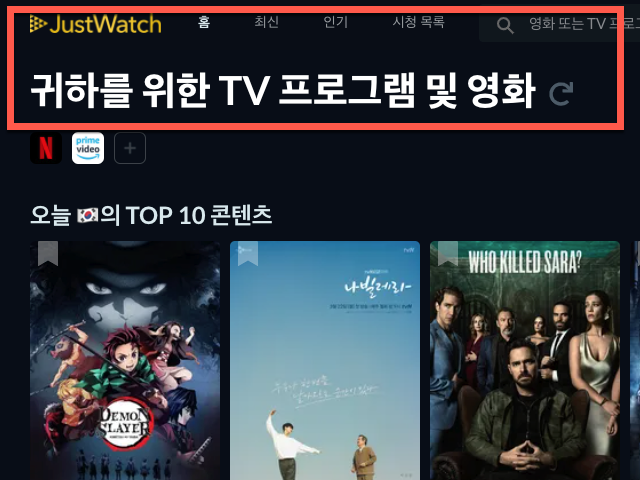 JustWatch 홈페이지에서 넷플릭스와 아마존프라임 등의 스트리밍과 현재 접속 중인 한국에서 볼 수 있는 영화, 드라마, 애니메이션 등의 수많은 정보를 나열하고 있습니다