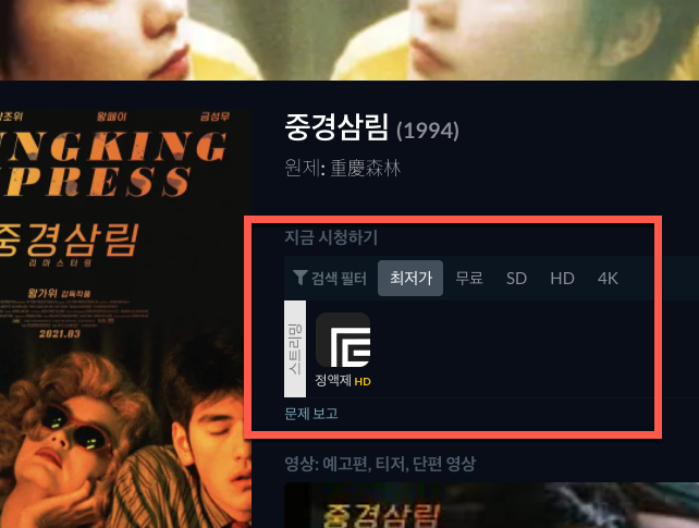 검색하였던 중경삼림은 한국에서는 현재 왓챠에서 만 정액제 스트리밍 서비스로 즐길 수 있다고 표시가 되고 있네요