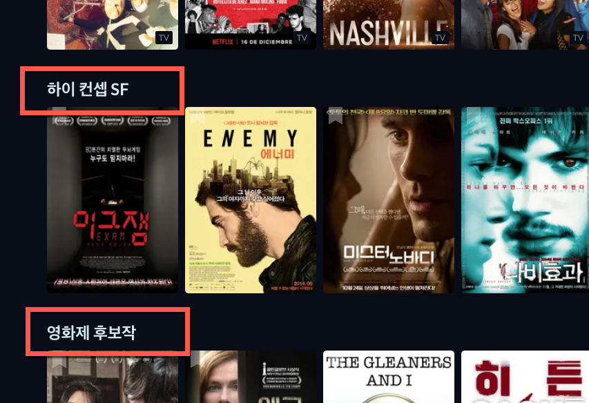 처음 페이지에서 화면을 아래로 내리면 각각의 테마 별로 다양한 영화나 다시 찾아서 보려는 영화들을 새로운 주제로 주말이나 휴가기간에 시청할 수 있도록 구성되어 있습니다