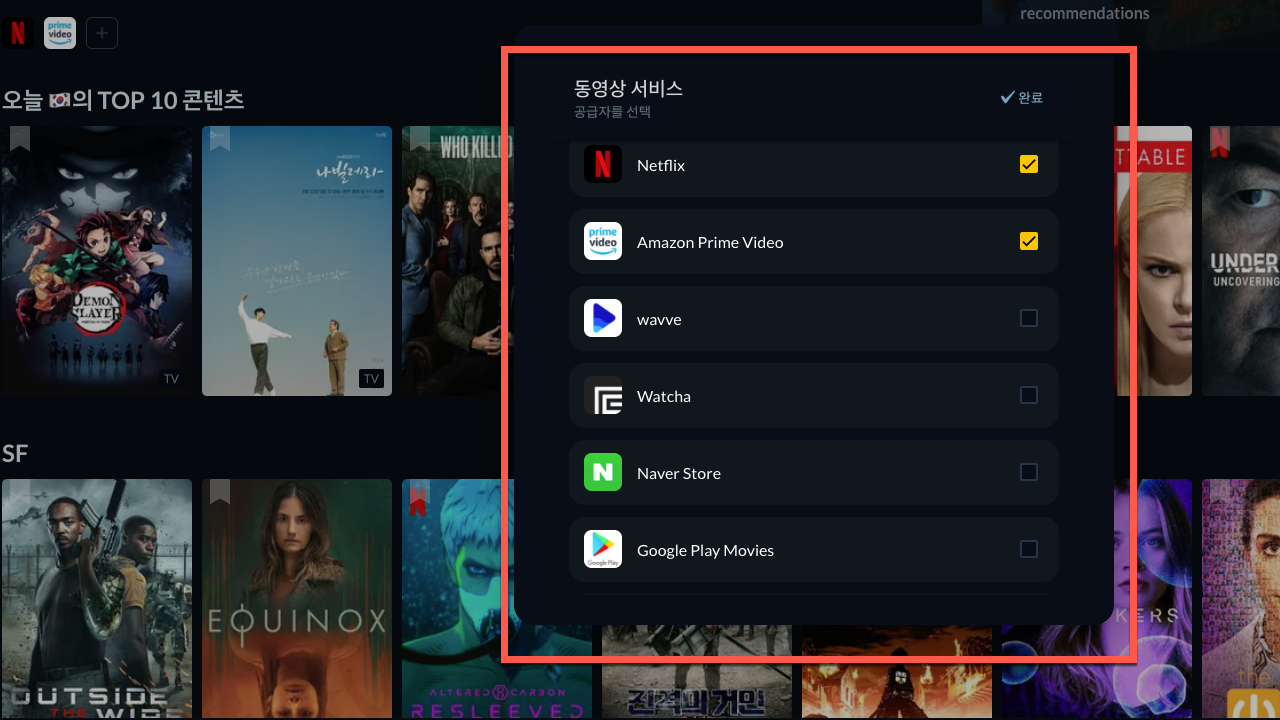 선택할 수 있는 동영상 서비스 공급자 목록에는 아래와 같이 21개가 표시가 됩니다