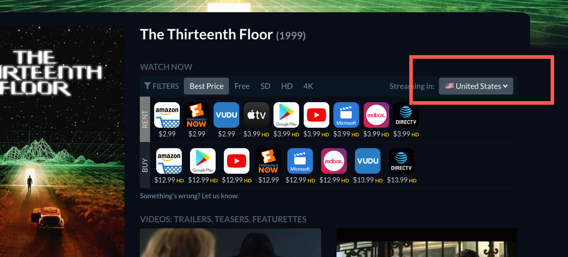 시청하려는 국가를 미국으로 변경하였을 때 더욱 다양한 각각 영화&드라마 스트리밍 서비스 제공업체 리스트와 금액을 확인할 수 있는 장점도 있습니다