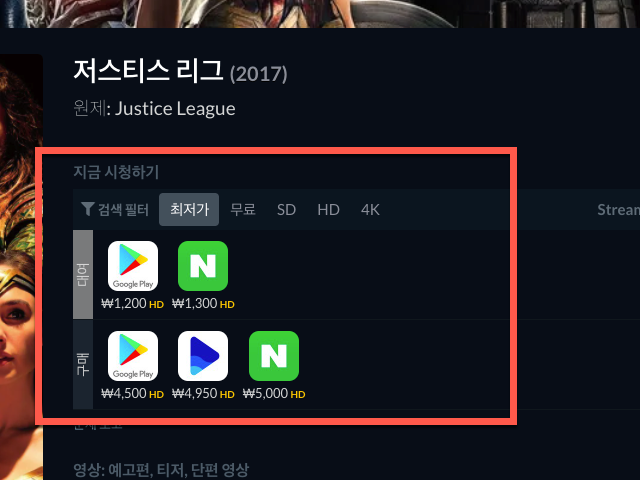 저스티스 리그는 구글플레이와 네이버에서는 대여로, 영화 동영상을 구입할 수 있는 곳은 구글과 네이버 그리고 웨이브에서 결제되는 금액까지 비교할 수 있도록 표시가 되어 있습니다