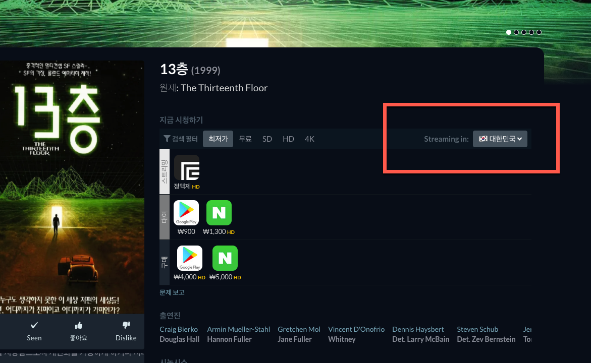 동일한 영화도 스트리밍 지역을 한국으로 선택할 때 모습과
