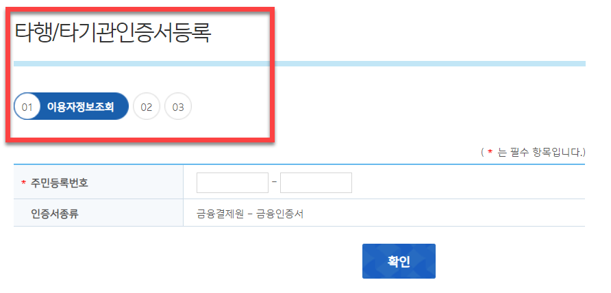 공인인증서 정보를 정확히 입력하셨다면, 이제부터는 <타행/타기관인증서등록> 의 1번째 단계로 <주민등록번호> 를 입력 후 <확인> 버튼을 클릭하여 다음 페이지로 이동을 해주시면 됩니다