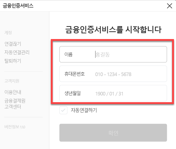 금융인증 서비스 방법을 선택하셨다면 처음 인증서를 발급받아서 이용하였던 과정과 동일하게 이름, 휴대폰 번호 그리고 생년월일을 모두 입력 후 <확인> 단추를 눌러 주시면 됩니다