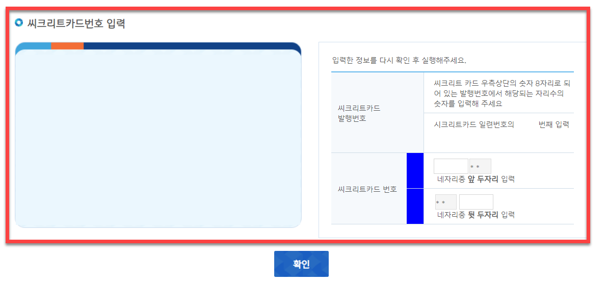 보안카드를 사용하는 경우에는 보유하고 있는 <씨크리트 카드> 에 일련번호의 일부와 카드에 표시되어 있는 번호 뒤에 있는 4자리 숫자 중에 각각 2자리를 입력해 주시면 됩니다