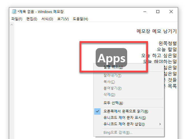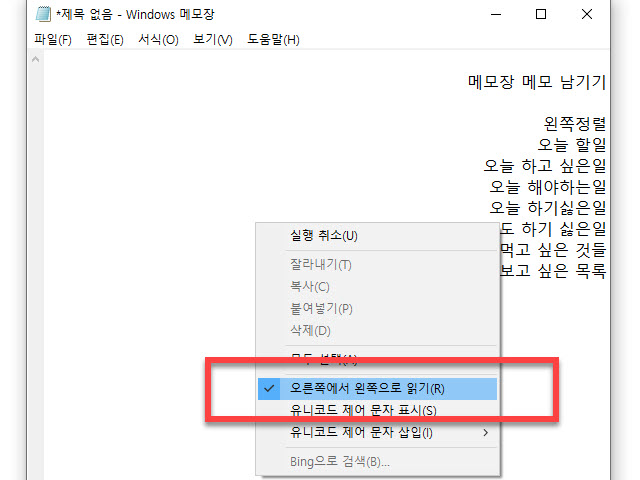 메모장 글 화면이 오른쪽 정렬로 보이는 현상 해결방법