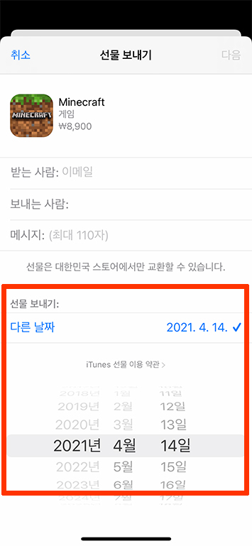 선물하기는 지금 당장 보내줄 수도 있지만, 다른 날짜를 선택하여 특정한 일자에 보낼 수 있도록 지원하고 있습니다
