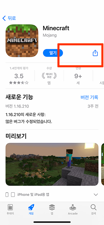 아이폰을 활용할 수 있는 무료&유료 어플을 다운로드 설치할 수 있는 앱스토어에서 실행하여 선물하려고 찜 해둔 어플의 페이지 단계까지 이동을 하면 다운로드 설치가 되어 있다면 <열기>로, 만약 나도 아직 구입하지 않은 어플인 경우에는 <받기> 로 상태가 표시되어 있는 버튼 오른쪽에 있는 사각형 모양 위에 화살표 그림이 있는 <공유> 버튼을 탭 하여 이동을 시작합니다