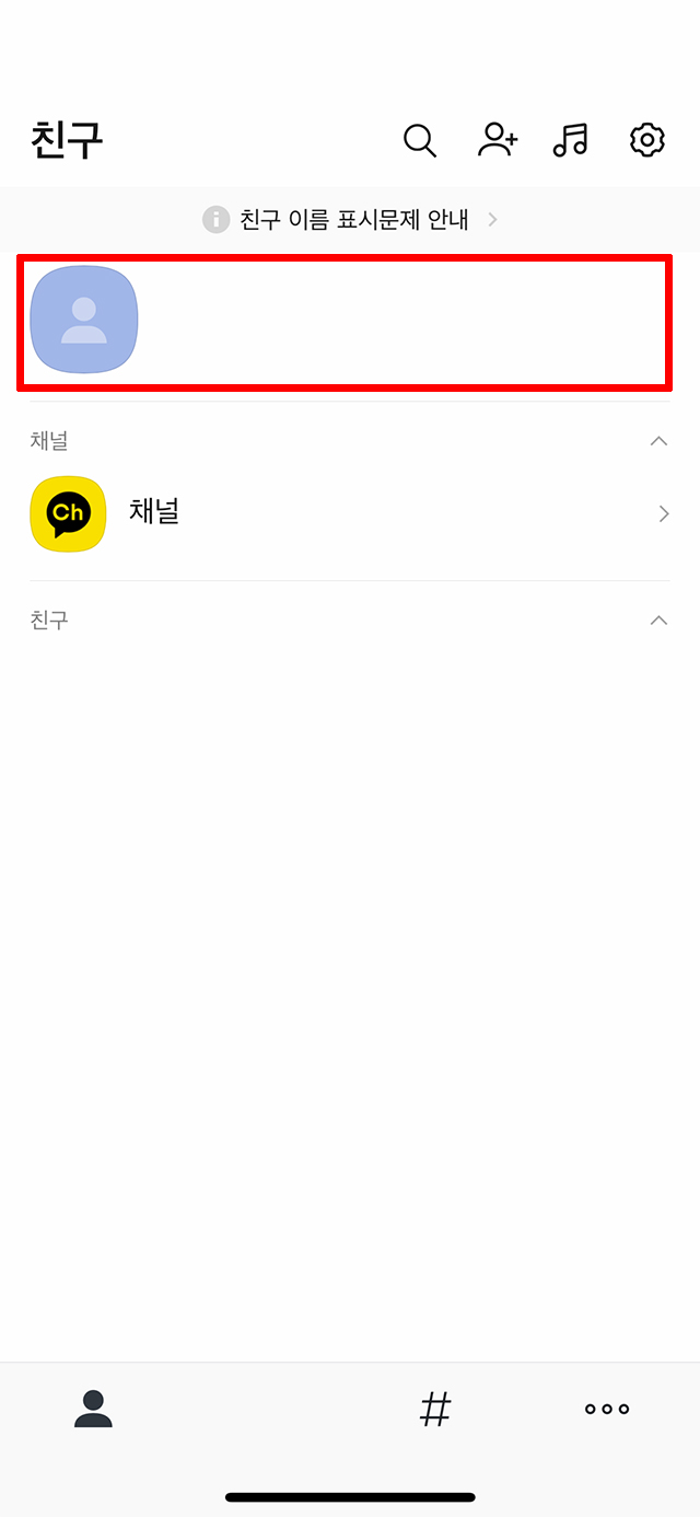 카카오톡을 실행 후 주고받은 채팅 목록이 아닌 <친구> 목록에서 작업을 시작해야 합니다