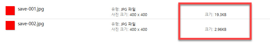 Adobe Photoshop 에서 동일한 이미지 파일 사이즈로 작업을 하였지만 일반적인 Save 메뉴를 사용하여 저장하였을 때와 웹용으로 저장하였을 때의 용량의 차이가 있다는 것을 파일크기에서 바로 알 수 있습니다