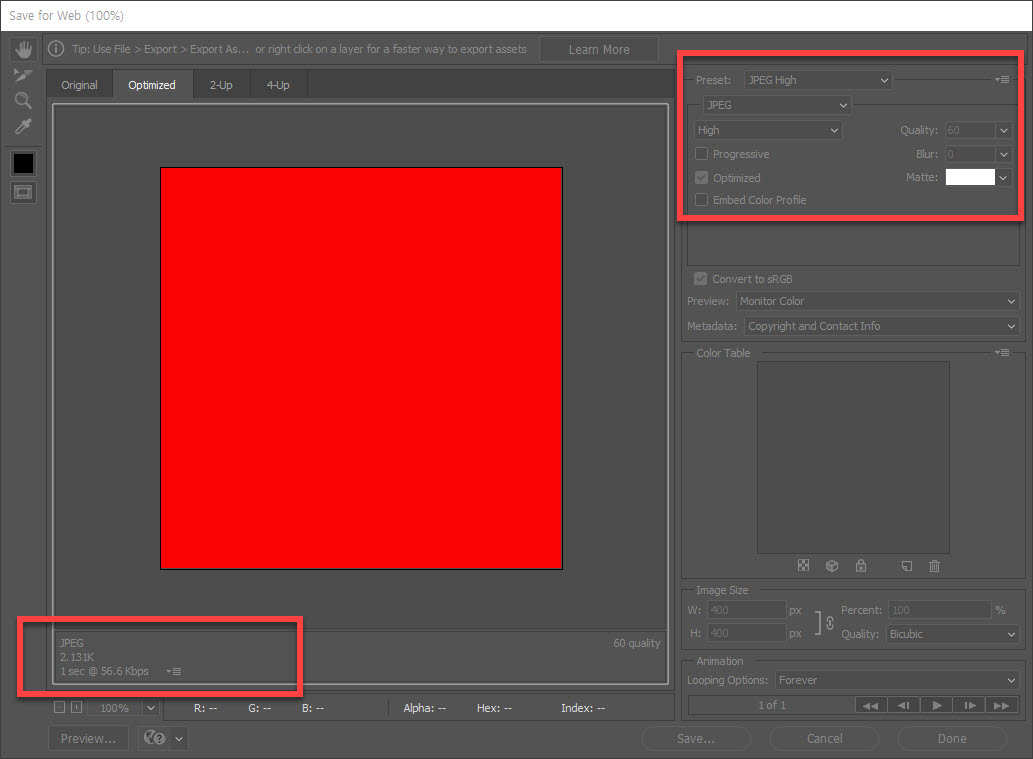 우측 상단에서는 jpg, png 등의 파일 형식의 변경과 함께 사용자가 Quality 저장 품질을 숫자를 변경하여 좌측 하단에 있는 저장될 파일의 용량과 인터넷 속도에 따른 전송 속도도 같이 표시가 되어 도움이 됩니다