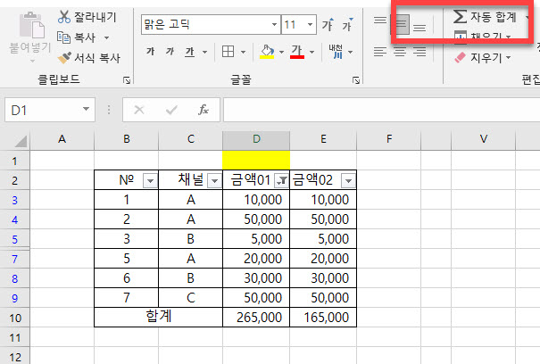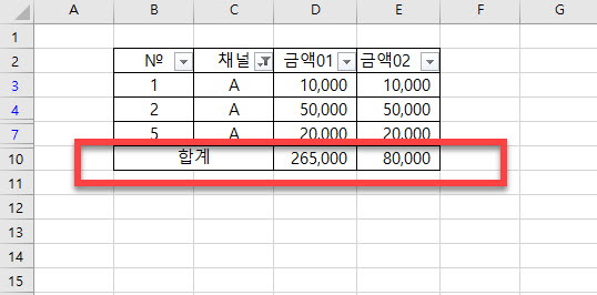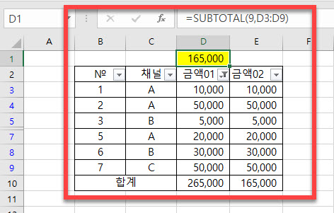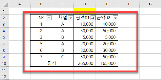 예제로 만들었던 엑셀에서 A채널의 금액 합계만 필터 기능을 사용하면 합계가 달라지는 모습을 알 수 있습니다