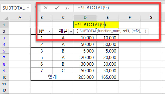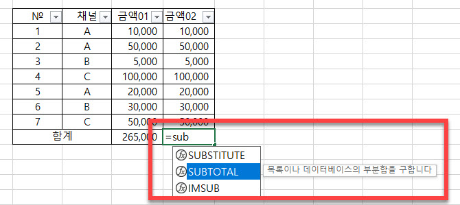 엑셀 sum 합계함수 보다 편리한 Subtotal 사용 활용하는 방법