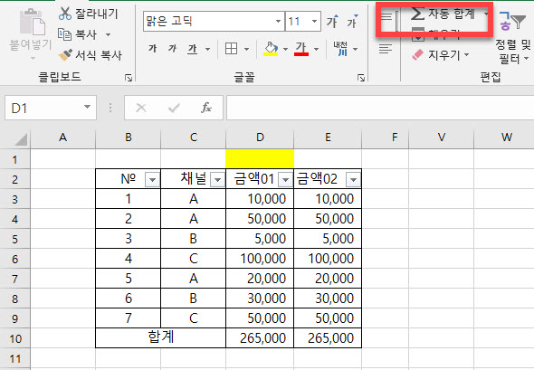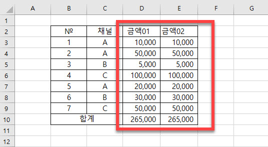 그림과 같이 전체 숫자의 합계를 구하는 결과값은 <금액01> 과 <금액02> 은 동일하게 보입니다