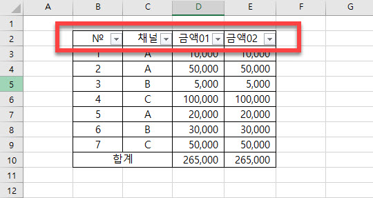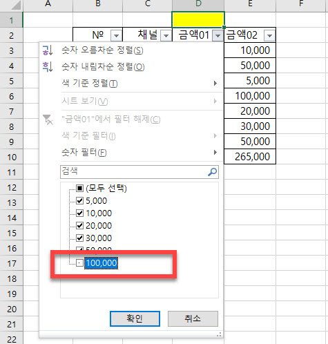 <금액01> 항목에 필터가 적용되었다는 아이콘이 표시가 된 모습을 눈으로 확인할 수 있습니다
