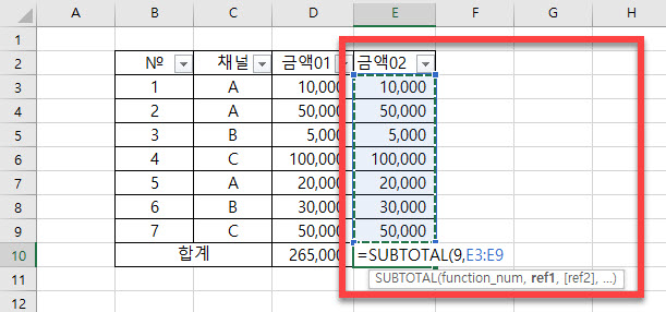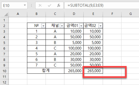 함수 사용이 틀리지 않았다면 화면과 같이 <금액02> 에서는 E10셀에서 사용하고 있는 subtotal 합계와 D2셀의 합계가 동일한 상태를 확인할 수 있습니다