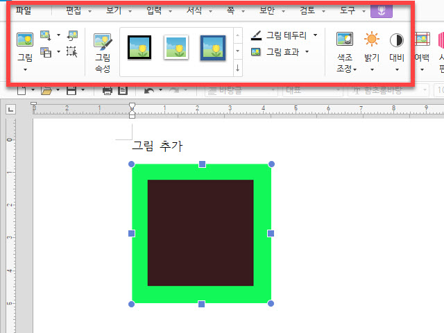 사진이나 그림을 추가한 다음 해당 영역을 마우스로 클릭하면 상단 메뉴가 변경이 되는 것을 알 수 있습니다