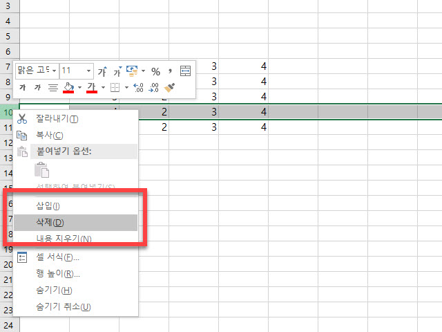 10행 을 삭제해야 한다면 숫자 ”10” 영역을 선택하면 해당 전체 행이 선택이 됩니다