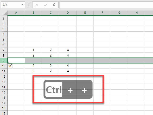 마지막으로 행과 열 에 셀을 추가하기 위해서는 삭제하는 방법과 동일하게 삽입하려는 행이나 열 을 선택 후 <Ctrl> + <+> 의 컨트롤 키와 플러스(+) 더하기 모양의 키보드 키 버튼의 조합을 사용하면 빠르게 추가할 수 있습니다