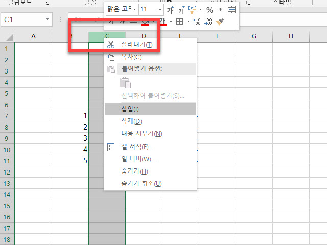 C열을 통 채로 삭제하기 위해서 또는 추가하기 위해서는 가장 위에 영어로 되어 있는 “C” 를 선택하면 열 전체를 선택하게 됩니다