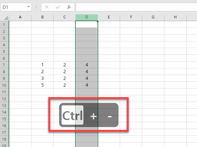 D열 전체를 선택 클릭한 상태에서 행 삭제할 때 사용하였던 단축키와 동일한 <Ctrl + - > 키를 선택하여 세로줄 전체를 없앨 수 있습니다