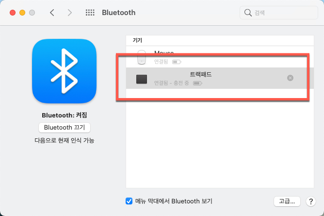장치를 연결하면 맥북 환경설정 블루투스 제어판 설정 목록 아래쪽에 있던 트랙패드가 상위로 올라오면서 연결 상태와 충전 상태가 표기가 됩니다
