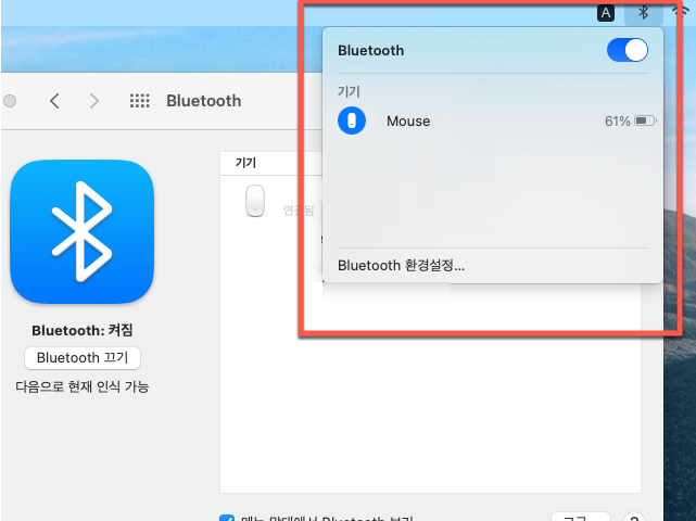 맥북 데스크탑 바탕화면 우측 상단에 있는 시스템 아이콘 영역에서 블루투스 아이콘을 찾았다면 마우스로 클릭하면 현재 애플 맥 컴퓨터에 연결하여 사용하고 있거나 사용하였던 블루투스 장치의 정보가 표시가 됩니다