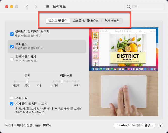 트팩패드를 선택하여 이동한 영역에서는 매직마우스를 선택하였던 모습과 비슷하게 이동속도, 클릭 등의 포인트 및 클릭 그리고 손가락을 사용하여 실행할 수 있는 명령어를 학습하거나 변경할 수 있습니다