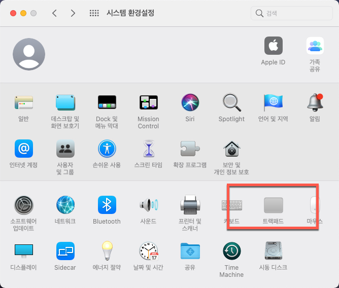 시스템 환경설정을 실행하면 이전에는 없었던 <트랙패드> 항목이 키보드와 마우스 사이에 자리 잡고 있는 모습을 확인할 수 있습니다